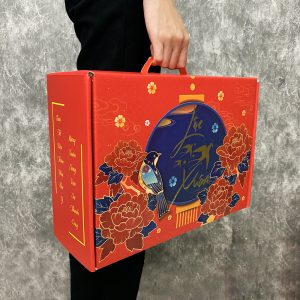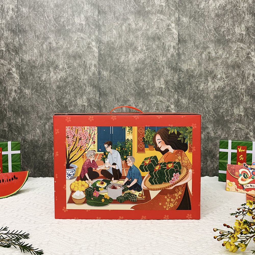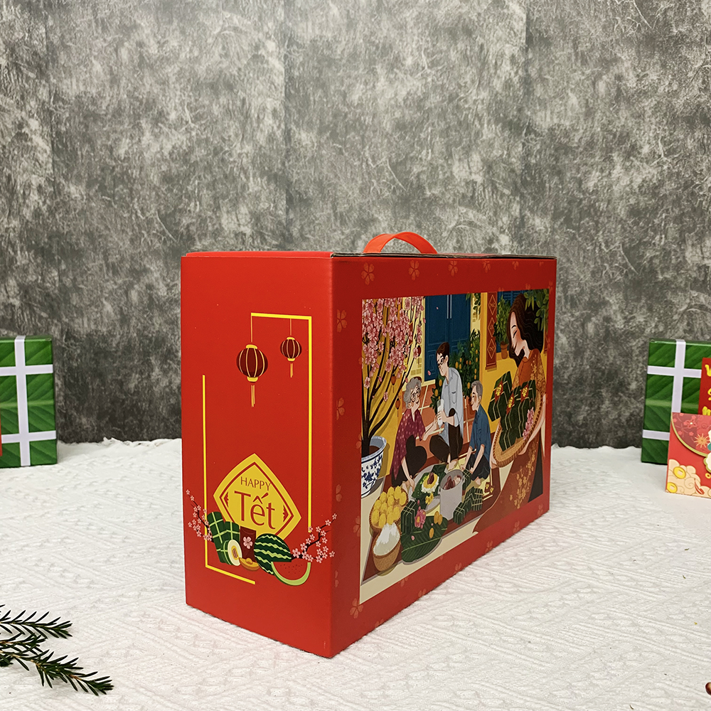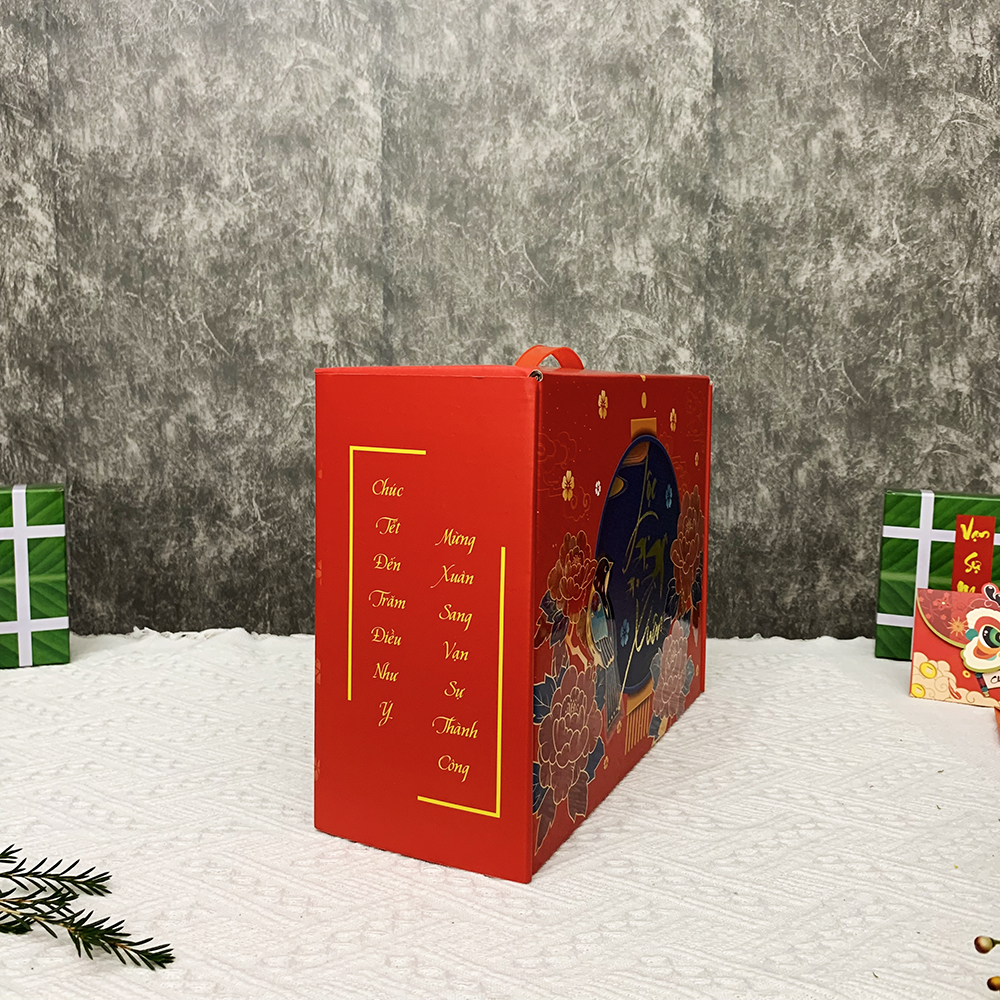 Hộp đựng quà Tết được thiết kế tinh tế, tỉ mỉ, với họa tiết hình chim én, mâm ngũ quả,… mang đậm không khí Tết cổ truyền Việt Nam. Hộp quà được in logo, thông điệp theo yêu cầu của khách hàng. Điều này giúp tạo ấn tượng tốt cho người nhận, thể hiện sự chuyên nghiệp, đẳng cấp của người tặng.